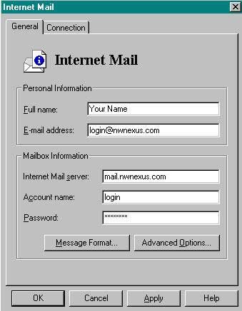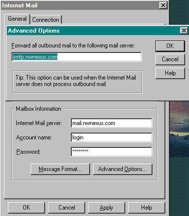 6. Click on the "Advanced Options" button and fill out the outbound mail field with smtp.nwnexus.com. Below is an example picture. Next, click the "OK" button.