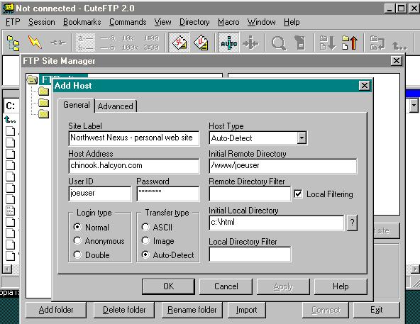 A: In this example, we will configure CuteFTP to upload and download to a web directory for a Personal or Premium Dialup account. Let's say the login is "joeuser." You would substitute your login name in place of joeuser in the