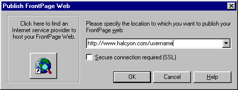 Once you've created your website and are ready to upload the files... When Frontpage Explorer opens, choose: Open an existing Web from your local computer. Go to the File Menu/Publish Frontpage WebIn the future, it will list the proper URL in the Publish window, but for now... Click on More Webs Enter http://www.halcyon.com/username